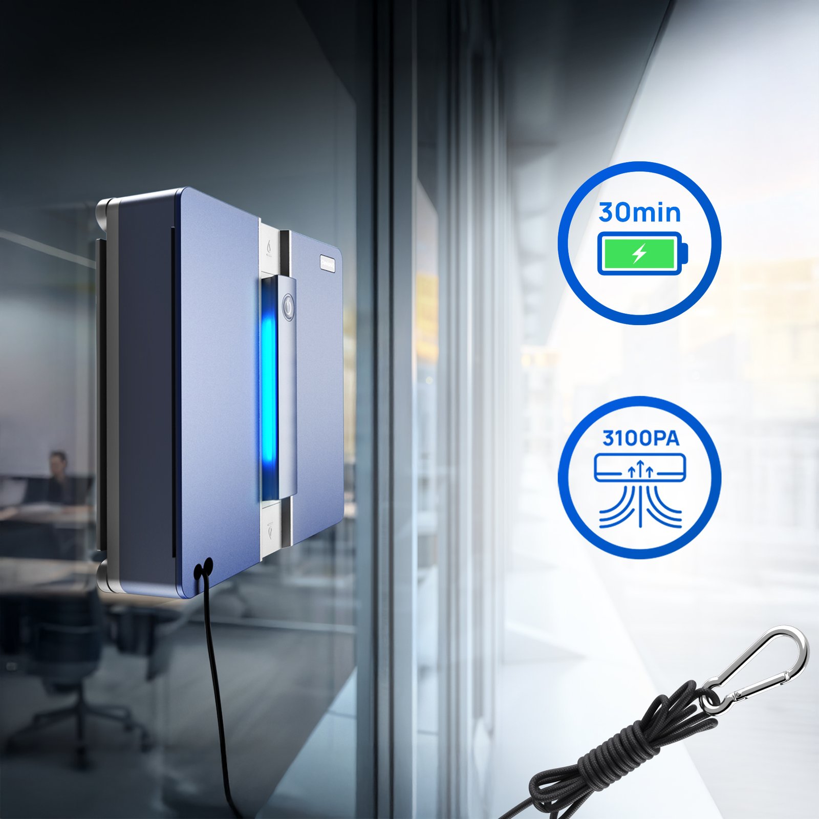 Nein, das Gerät benötigt einen Stromanschluss. Bei einem Stromausfall kann der Roboter jedoch bis zu 30 Minuten lang sicher am Fenster befestigt bleiben.